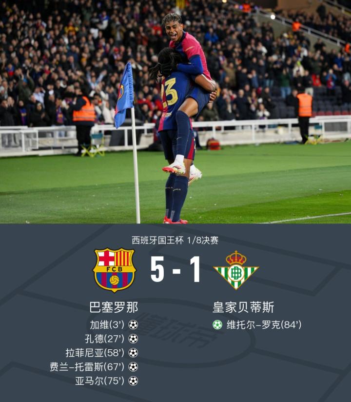 第3分钟,奥尔莫的助攻为加维的进球开了个好头,巴萨1-0领先。接着,亚马尔的传球找到位置,孔德稳稳将球送入球网,巴萨2-0大幅领先。下半场,拉菲尼亚突破射门得手,将比分扩大到3-0。随后,奥尔莫再次助攻,替补登场的费兰-托雷斯也有进球,巴萨4-0领先。亚马尔的进球让球队的士气更加高涨,而费尔明的助攻也为球队增光添彩,巴萨5-0领先。最终,贝蒂斯在比赛末段罗克的点球扳回一城,但无法改变比赛局势,巴萨5-1大胜贝蒂斯晋级八强。